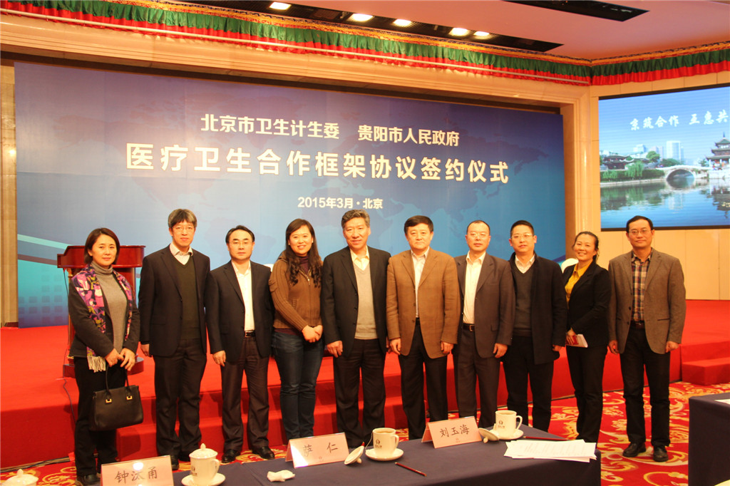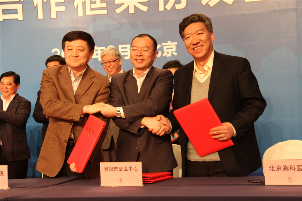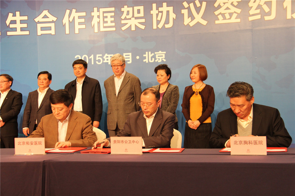 2015年3月2日,北京市衛(wèi)計(jì)委與貴陽市人民政府醫(yī)療衛(wèi)生合作框架協(xié)議暨京筑兩地醫(yī)療機(jī)構(gòu)合作協(xié)議簽約儀式在京舉行。省委常委、市委書記陳剛、北京市衛(wèi)計(jì)委主任方來英代表雙方簽定了合作框架協(xié)議。貴陽市8家醫(yī)療機(jī)構(gòu)分別與北京市9家醫(yī)院簽訂了合作協(xié)議書。中心黨委書記、主任劉隆平分別與北京佑安醫(yī)院、北京胸科醫(yī)院簽訂了合作協(xié)議書。中心副書記、副主任劉建西、副主任梁躍東以及醫(yī)務(wù)、科教、中心辦公室等相關(guān)領(lǐng)導(dǎo)參加了簽約儀式。