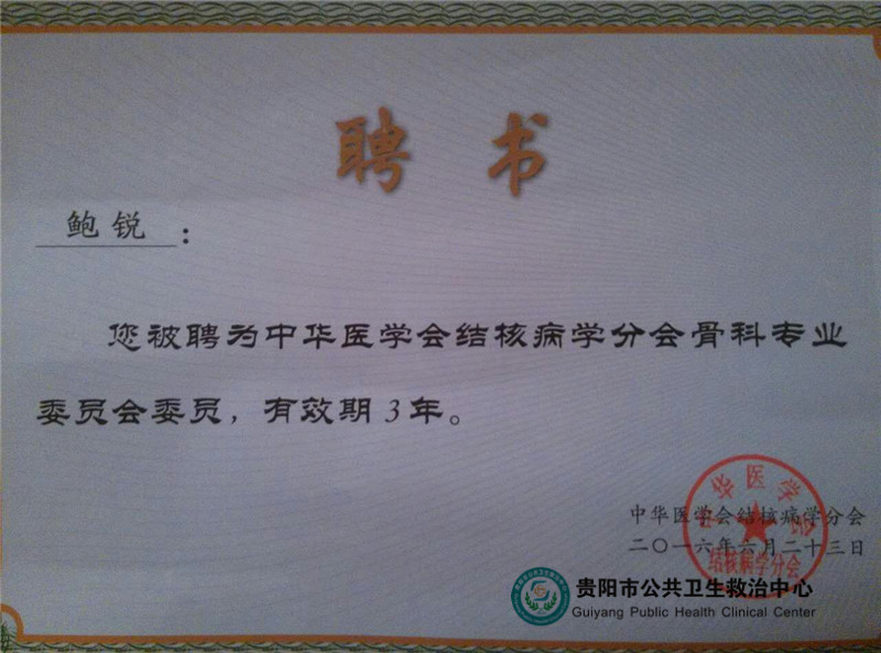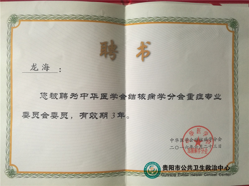 除了享受學術(shù)上的饕餮盛宴,我院參會代表在本次大會上還喜獲各項殊榮:骨科副主任鮑銳被聘為“中華醫(yī)學會結(jié)核病學分會骨科專業(yè)委員會委員”、ICU副主任龍海被聘為“中華醫(yī)學會結(jié)核病學分會重癥專業(yè)委員會委員”、放射科副主任張蔚被聘為“中華醫(yī)學會結(jié)核病學分會影像專業(yè)委員會委員”。龍海還獲得了大會評選的“最美結(jié)核人”獎。