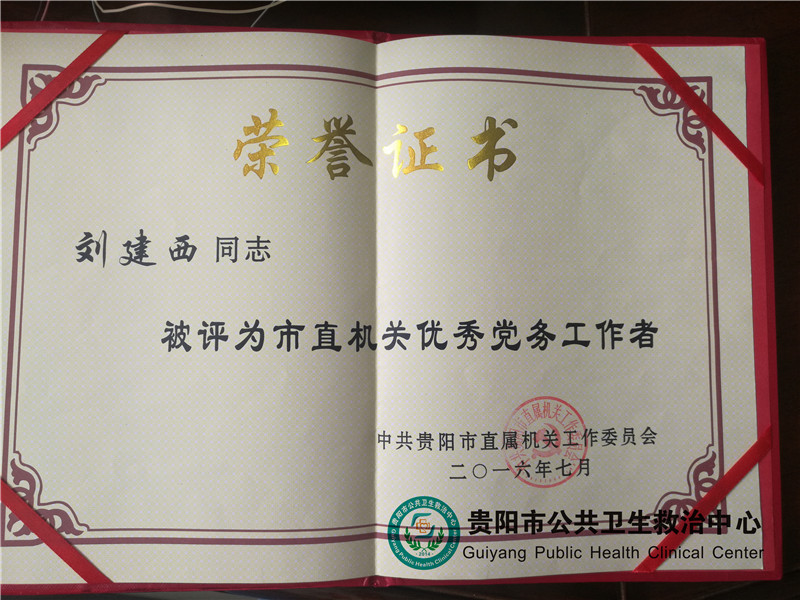 ——公衛(wèi)中心黨委書記劉建西同志榮獲貴陽市直機(jī)關(guān)“優(yōu)秀黨務(wù)工作者”稱號