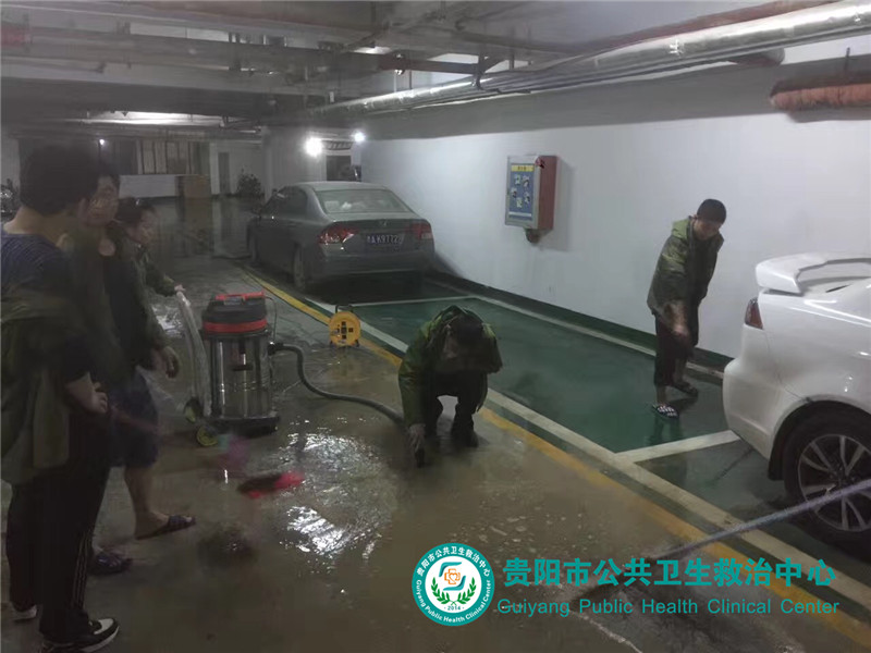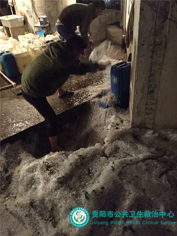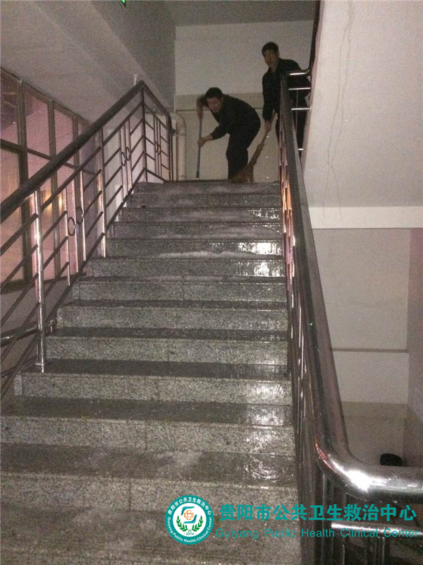 電工班長羅勇冒著瓢潑大雨首先到達(dá)四樓平臺疏通被堵下水管口,排水口疏通后,四樓積水迅速下降,為后續(xù)的搶險創(chuàng)造了有利的條件??倓?wù)科協(xié)調(diào)各班組進(jìn)行積水清理,因現(xiàn)場人員不足,保潔公司馬上協(xié)調(diào)組織周邊醫(yī)院保潔人員到現(xiàn)場進(jìn)行清掃。對重點醫(yī)療設(shè)備(如:電梯井、制氧機(jī)房等)進(jìn)行巡查,保障重要設(shè)施不受損害。保潔人員和貴陽市楚天環(huán)境公司工作人員對污水處理站倒灌堆積的冰雹進(jìn)行清理,保障污水處理設(shè)施的正常運行。凌晨2點左右,所有搶險工作基本完成,樓內(nèi)積水基本清理完畢。