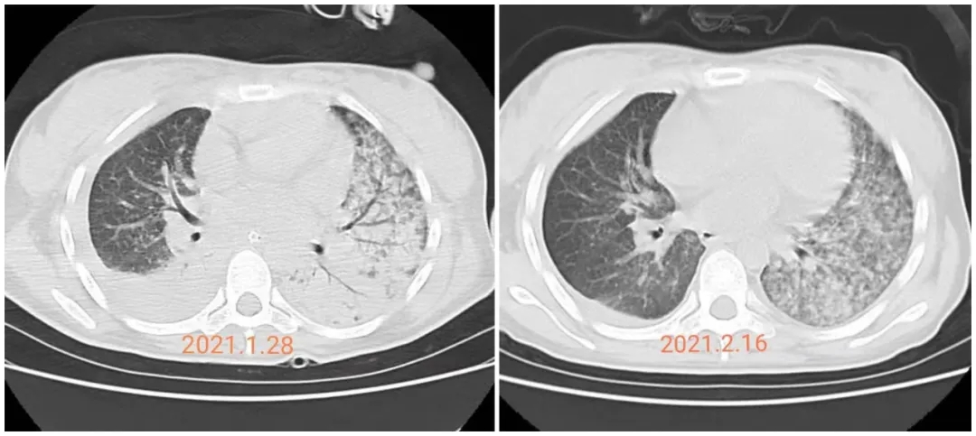經(jīng)過(guò)醫(yī)護(hù)團(tuán)隊(duì)的共同努力,患者于2021年2月2日成功拔除氣管插管,改予無(wú)創(chuàng)呼吸機(jī)輔助通氣治療,于2021年2月4日復(fù)查胸部CT見雙肺病灶較前明顯吸收改善,患者病情逐漸恢復(fù),逐漸拔除胃管及尿管、中心靜脈置管,于2021年2月8日轉(zhuǎn)入ICU康復(fù)病房繼續(xù)治療,于2021年2月19日好轉(zhuǎn)出院。